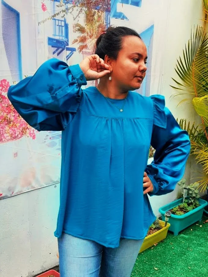Découvrez notre nouveau patron, une blouse longues manches volantée aux épaules.